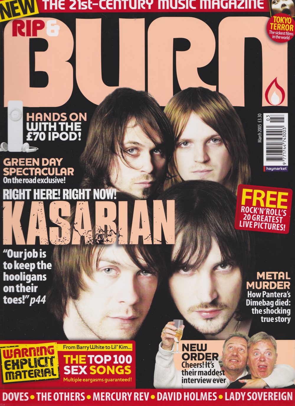 If Kasabian’s rhetoric has struck a chord, it’s probably because they make being a rock star look such a gas. They spent the summer festival circuit hob-nobbing with the likes of the Wu-Tang Clan (Serge: ‘We were off our faces’), supported The Who at the band’s behest (Tom: ‘Roger Daltrey was wonderful. Pete was playing the rock’n’roll star with his shades on – he’s actually pretty short’) and had their photos taken by kindred hedonist David Bailey (Tom: ‘He was like Father Christmas’) for Vogue.Their publicist, meanwhile, enthuses about the support of The Streets, Mani, Avid Merrion, Stuart ‘Pyscho’ Pearce, Primal Scream,The Prodigy and The Clash’s Mick Jones. Oh, and Sir Peter Blake.