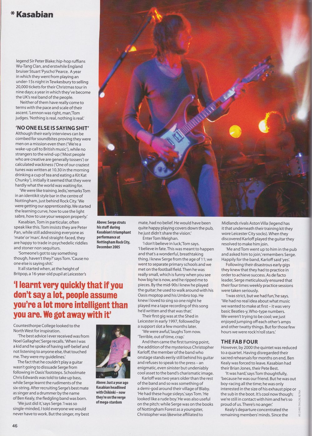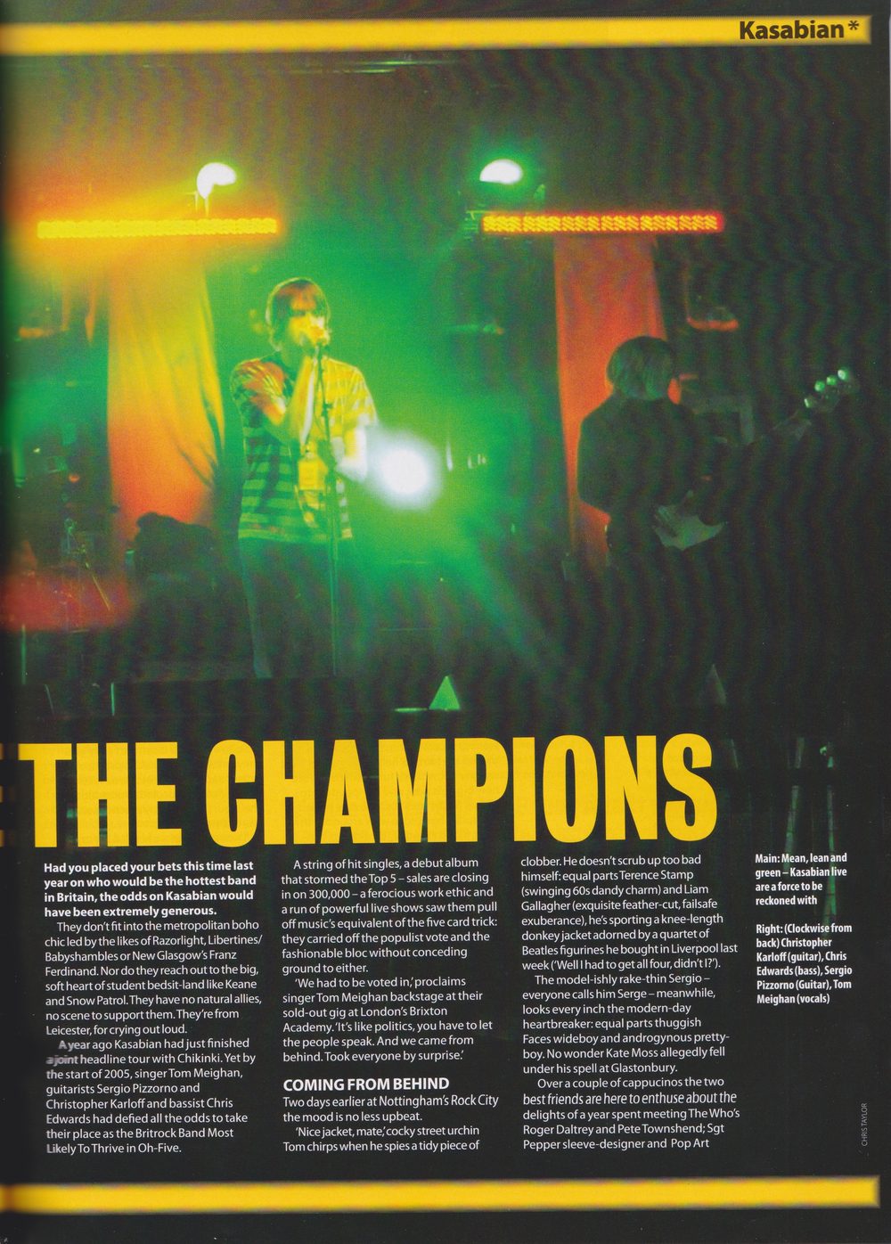 A year ago Kasabian had just finished a joint headline tour with Chikinki. Yet by the start of 2005, singer Tom Meighan, guitarists Sergio Pizzorno and Christopher Karloff and bassist Chris Edwards had defied all the odds to take their place as the Britrock Band Most Likely To Thrive in Oh-Five.