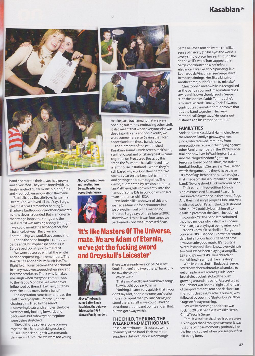 And the name Kasabian? Half-inched from the Manson Family’s getaway driver, Linda, who received immunity from prosecution in return for testifying against other Family members in the 1970 murder trial; she now lives in Washington State. And their logo: freedom fighter or terrorist? ‘Based on the Ultras, the Italian football hooligans, ‘Serge says. ‘We used to watch the games and they’d have these 100-foot flags behind the nets. It was just that image of “This is our team, this is our band.” No-one should fuck with your band.’