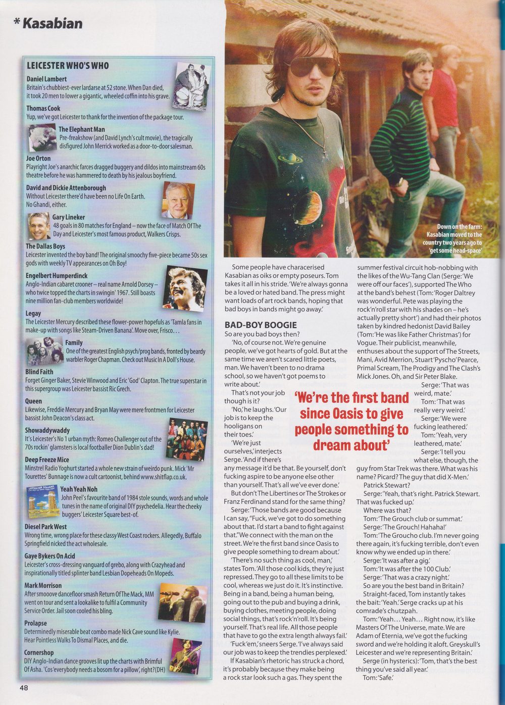 Kasabian, Tom in particular, often speak like this.Tom insists they are Peter Pan, while still addressing everyone as ‘mate’ or ‘man’. And straight-faced, they are happy to trade in psychedelic riddles and stoner non sequiturs. ‘Someone’s got to say something though, haven’t they?’ says Tom. ‘Cause no one else is saying shit.’ It all started when, at the height of Britpop, a 16-year-old pupil at Leicester’s Countesthorpe College looked to the North West for inspiration.