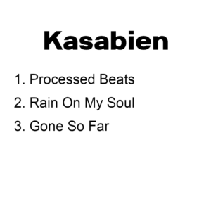01 Processed Beats Processed Beats Kasabian 02 Gone So Far Gone So Far Kasabian 03 Rain On My Soul Rain On My Soul KasabianTracklist Processed Beats [Demo] Gone So Far Rain On My Soul Release date: 2003 Format: CD-R Master release